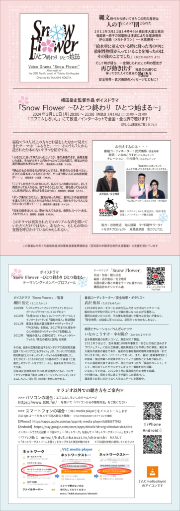 そして2024年、被災地を舞台にハマカルアートプロジェクトのコンテンツのひとつとしてボイスドラマ「Snow Flower」を制作した。